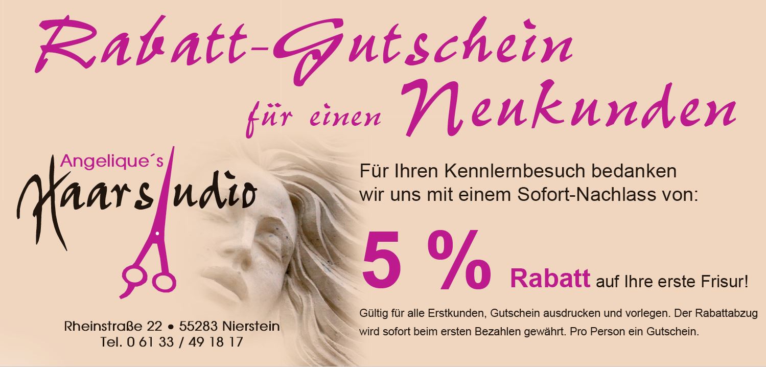 Für Ihren ersten Kennlern-Besuch in unserem Salon bedanken wir uns bei Ihnen mit 5% SOFORT-Nachlass auf Ihre erste Frisur!